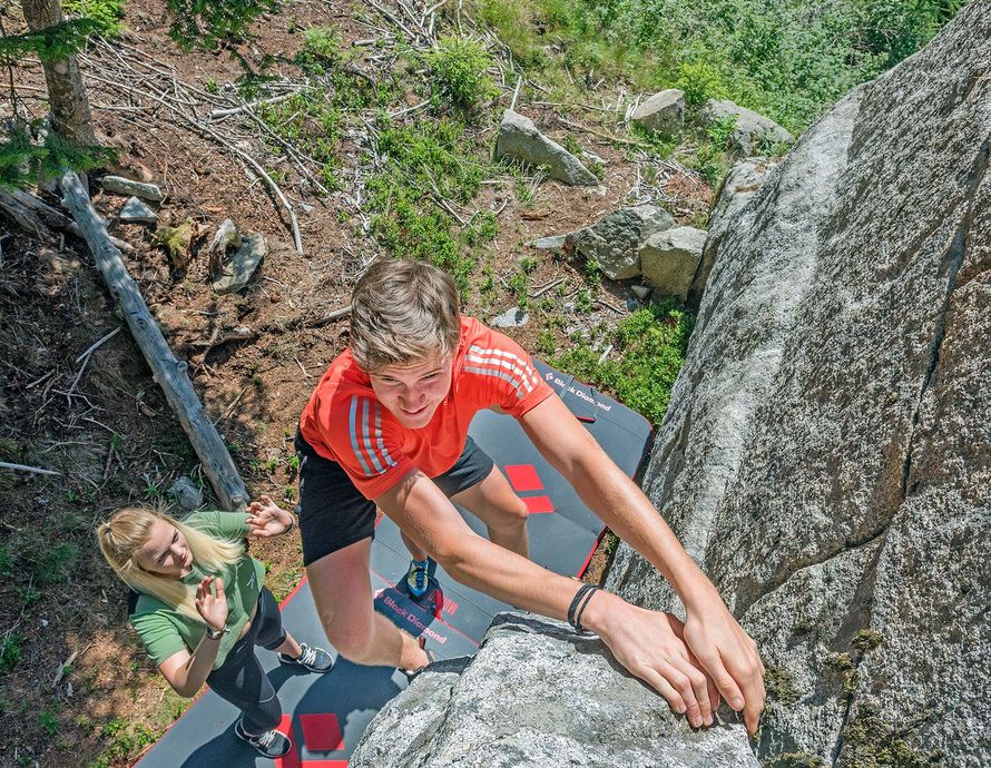 Für alle die sich lieber etwas mehr in Bodennähe auspowern möchten gibt es in Schenna seit 2016 das Bouldergebiet Gsteier. Auf einer Höhe von ca. 1.600 Metern befinden sich knapp 60 bereits geputzte Boulder. Die Grade reichen von 4a–Aufwärmlinien bis zu einer 8a.